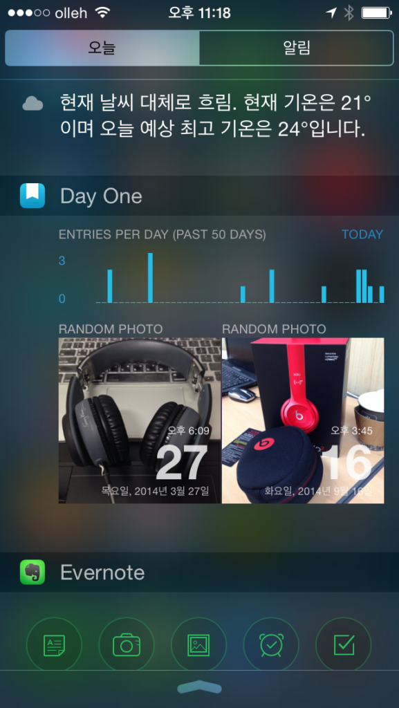 제가 사용하는 어플리케이션 중에는 DayOne, EverNote, DropBox, Yahoo 날씨, 등의 어플리케이션이 위젯 지원기능이 이미 업데이트 되어 있었습니다.