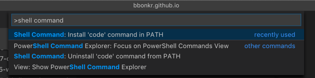 명령 팔레트를 열고 (Command ⌘ + Shift ⇧ + p), Shell Command: Install 'code' command in PATH를 선택합니다.
